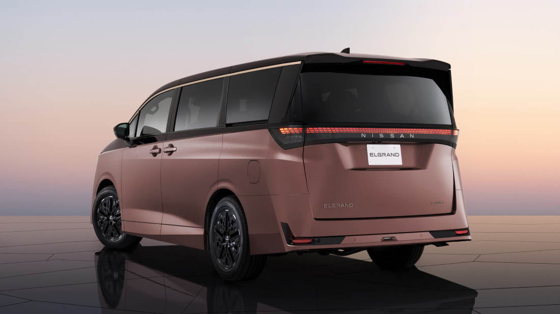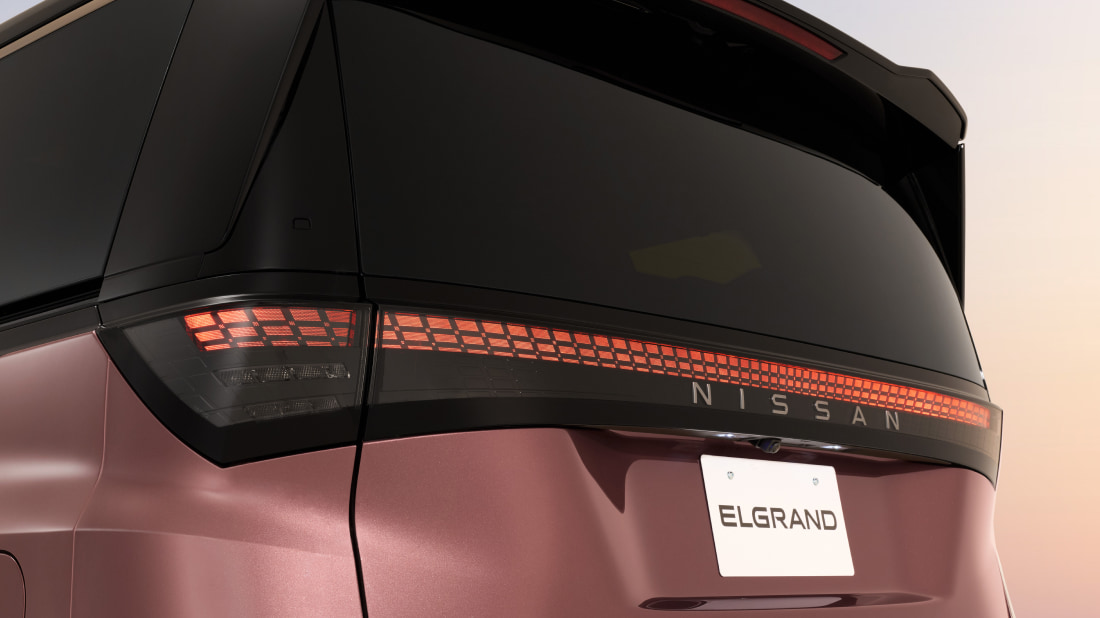 The exterior design features a commanding stance, with a grille motif inspired by the Japanese Kumiko pattern that blends into the frontal light signature. The Elgrand's color palette includes Fuji Dawn, a new hue inspired by the combination of dawn over Mount Fuji, and Shigoku, a deep red-purple symbolizing elegance and nobility.
