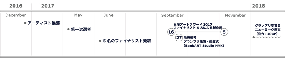 その後、2017年5月、第一次選考を行い、世界を拠点に活動する美術関係者5名からなる審査委員会により、25名の候補者から5名をファイナリストとして選出しました。