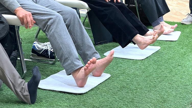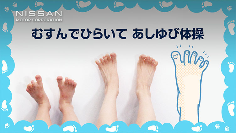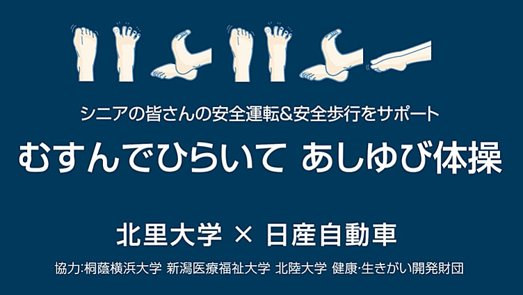 日産自動車と北里大学との共同研究により、足指で地面をつかむ力(足指の握力)がドライバーの運転操作に影響を与えることが分かりました。そこで足指を鍛え、身体機能や安全意識を高める「むすんでひらいて あしゆび体操」を制作しました。その社会実装を進めています。