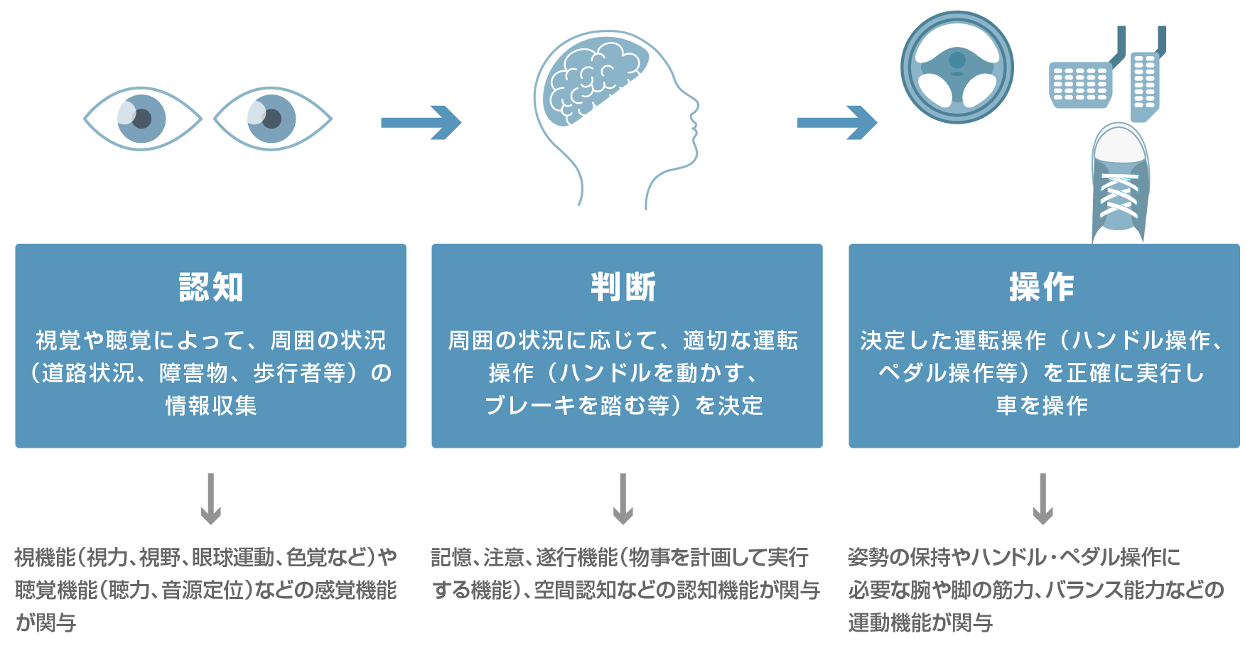“認知”には、視機能や聴覚機能などの感覚機能、“判断”には、遂行機能、空間認知機能、“操作”には、ハンドル操作、ペダル操作を正確に、ときに素早く行うための腕や脚の筋力、姿勢を保持するためのバランス能力などの運動機能が必要です。