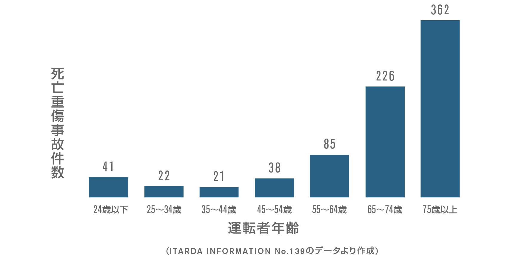 “認知”、“判断”、“操作”の能力が低下すると、事故につながる可能性が高くなります。今回の研究では、特に“操作”の能力に着目しました。前述のとおり、“操作”には筋力やバランス能力などの運動機能が必要ですが、加齢に伴い、これらの機能は低下していきます。一例として、図2に下腿三頭筋(ふくらはぎの筋肉)面積の加齢による低下を示します。筋肉の面積(筋肉量)は男性も女性も20歳代から徐々に減少し始めますが、60歳代から減少の速度が速くなります。下腿三頭筋はペダルの踏み込みに必要な筋肉の一つですので、筋肉量の減少はペダルの操作能力に何らかの影響が出てくる可能性があります。運動機能との因果関係は不明ですが、ペダルの踏み間違いによる死亡重傷事故件数は、年齢が高いほど多くなることが報告されています(図3)(ITARDA INFORMATION No.139。交通事故総合分析センター)。