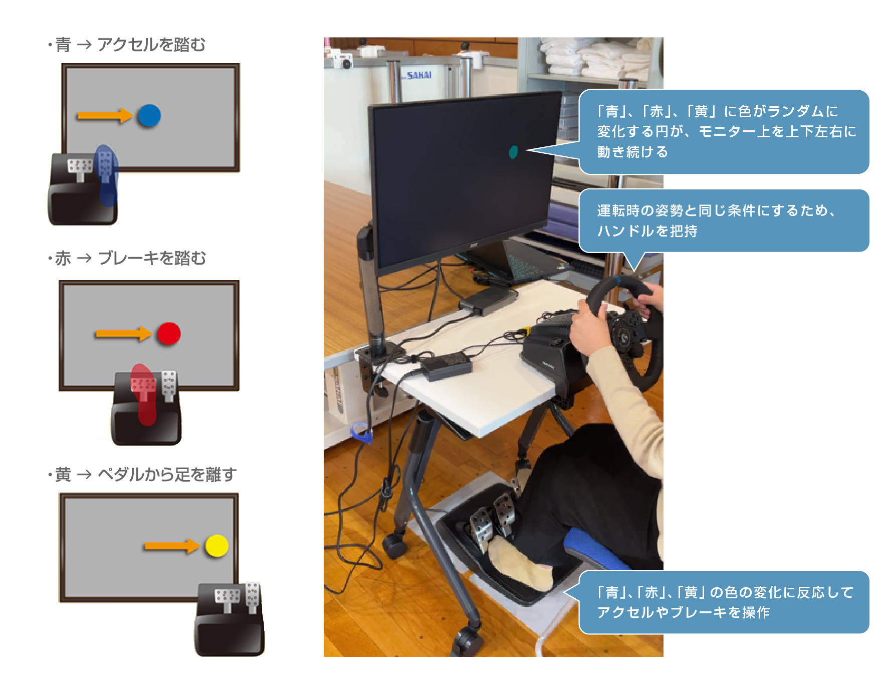 参加者は椅子に座り、机に固定されたハンドルを握った状態で、前方のモニターを見ながら足元のアクセル、ブレーキのペダルを操作します。モニターには、ターゲットの円が表示され、円は上下左右にランダムに移動しながら、「青」、「赤」、「黄」、いずれかの色にランダムなタイミングで変化します。参加者は、ターゲットの円が「青」ならアクセル、「赤」ならブレーキ、「黄」ならペダルから足を離します(図4左)。色が変化したら、できるだけ速く踏み替えを行うように指示しました。練習して慣れた後、踏み替え課題を90秒間実施しました。