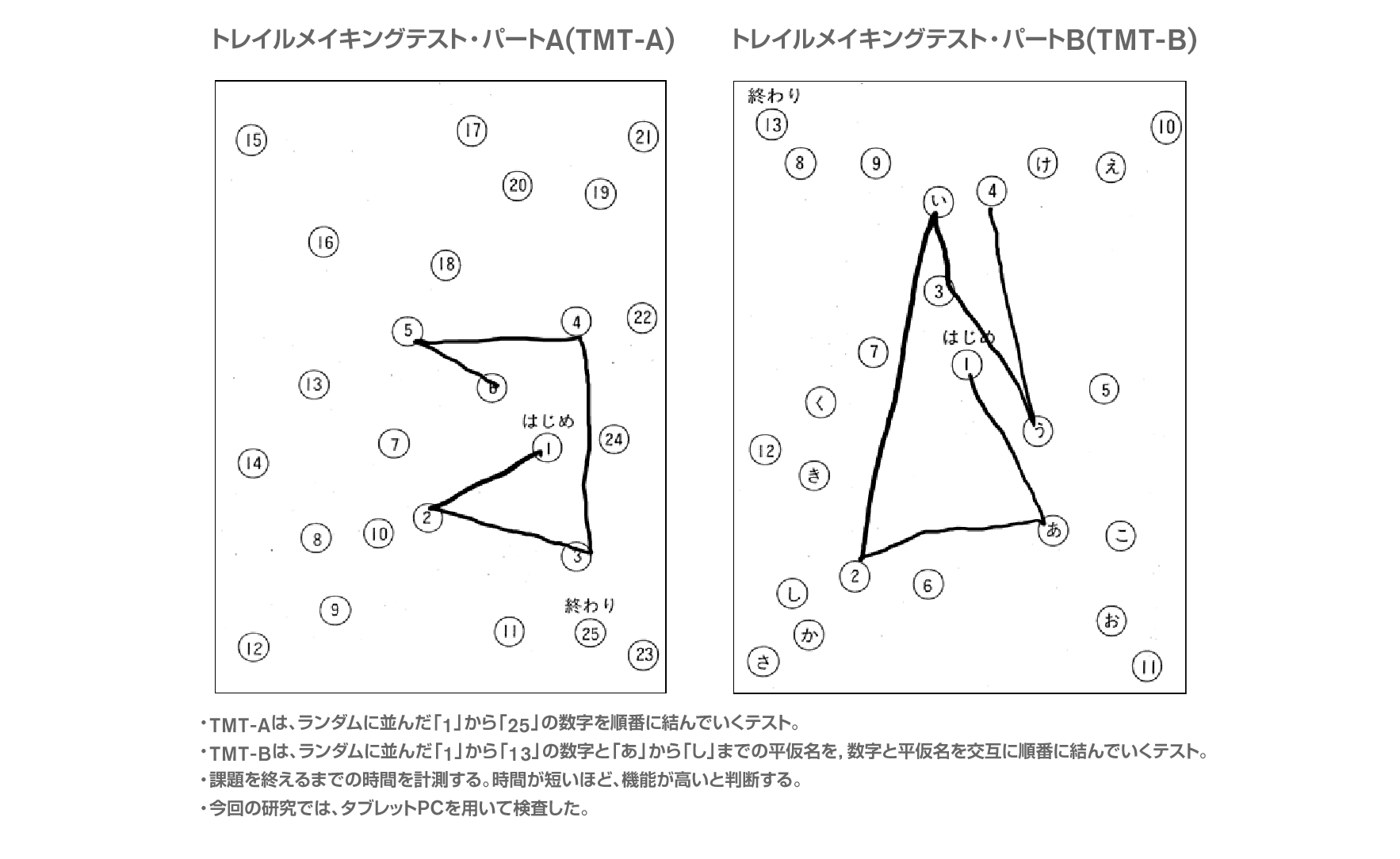 認知機能の測定項目は、トレイルメイキングテスト・パートA(TMT-A)、パートB(TMT-B)としました(図6)。このテストは、注意機能(注意の配分、切り替え、ワーキングメモリ、空間的探索などの情報処理能力)と遂行機能(処理速度)を総合的に評価できます。TMT-Aはランダムに並んだ数字を順番に線でつなぐテスト、TMT-Bはランダムに並んだ数字と平仮名を交互に線でつなぐテストで、難易度はTMT-Bのほうが高くなります。どちらも運転との関連性があると言われています。