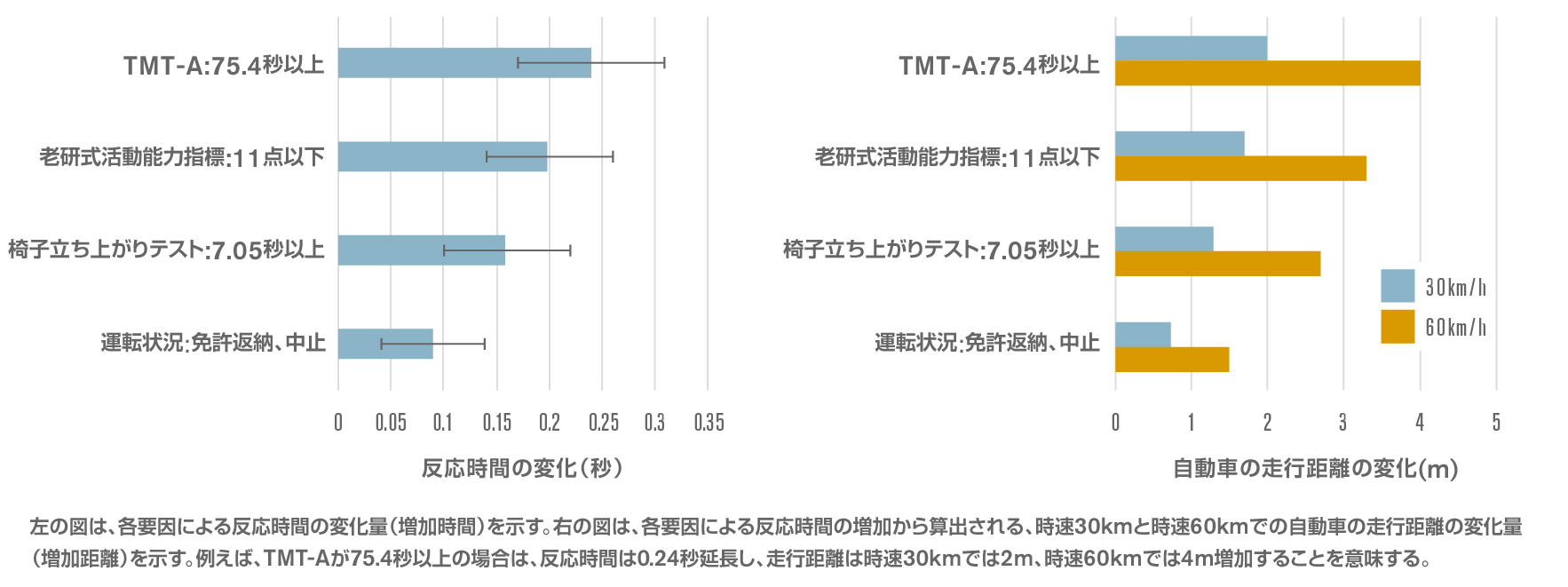 結果を図7に示します。反応時間への影響が大きかった要因は、TMT-Aが75.4秒以上(認知機能低下)、老研式活動能力指標11点以下(生活機能低下)、椅子立ち上がりテスト7.05秒以上(運動機能低下)、免許返納または中止(調査時の運転経験なし)の4つの要因でした。興味深いのは、免許の返納や運転の中止による反応時間の延長量は、認知機能、運動機能、生活機能の低下による反応時間の延長量と比べて小さいことでした。つまり、運転を辞めることよりもこれらの機能が低下することのほうがペダル操作能力への影響が大きいということになります。認知機能、運動機能、生活機能の全てが低下している場合、計算上は反応時間が0.6秒延長し、30km/hで5m長く走行し、60km/hで10m長く走行することになります。認知機能の低下はなくても、運動機能、生活機能の2つが低下していると、反応時間は0.36秒延長し、 30km/hで3m、60km/hで6m長く走行します。つまり、認知機能、運動機能、生活機能を維持することが、ペダル操作能力において重要であると言えそうです。