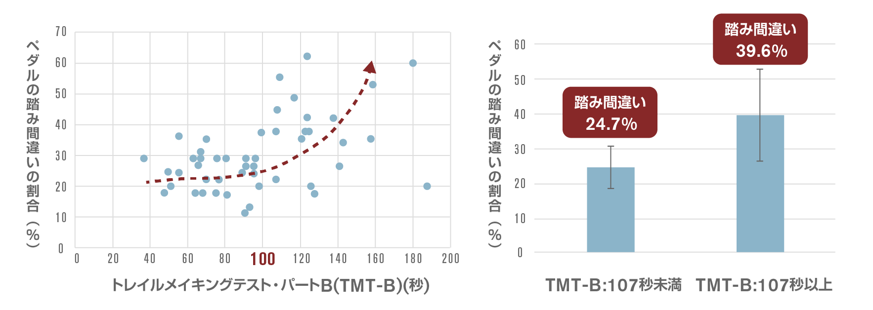 次に、ペダル踏み間違い割合にどのような要因が影響しているのかを統計学的に分析したところ、認知機能の指標であるTMT-Bのみが関連し、TMT-Bの時間が延長するほど、ペダル踏み間違いの割合が増加することがわかりました(図8左)。また、グラフをよく見ると、TMT-Bの時間が100秒以下の人は全員踏み間違いの割合が40%以下であるのに対し、TMT-Bが100秒を超えると踏み間違いの割合が50%を超える人が多くなっています(図8左、赤矢印)。そこで、踏み間違いの割合に差が生じるTMT-Bの時間を統計学的に推定してみると、107秒を境に踏み間違いの割合が大きく変化することがわかりました(図8右)。TMT-Bは難易度の高いテストであるため、この時間が107秒以上であっても認知症であるとは言えませんが、認知機能がある一定のレベルを下回るとペダル踏み間違いの危険性が高くなる可能性がある、とは言えそうです。