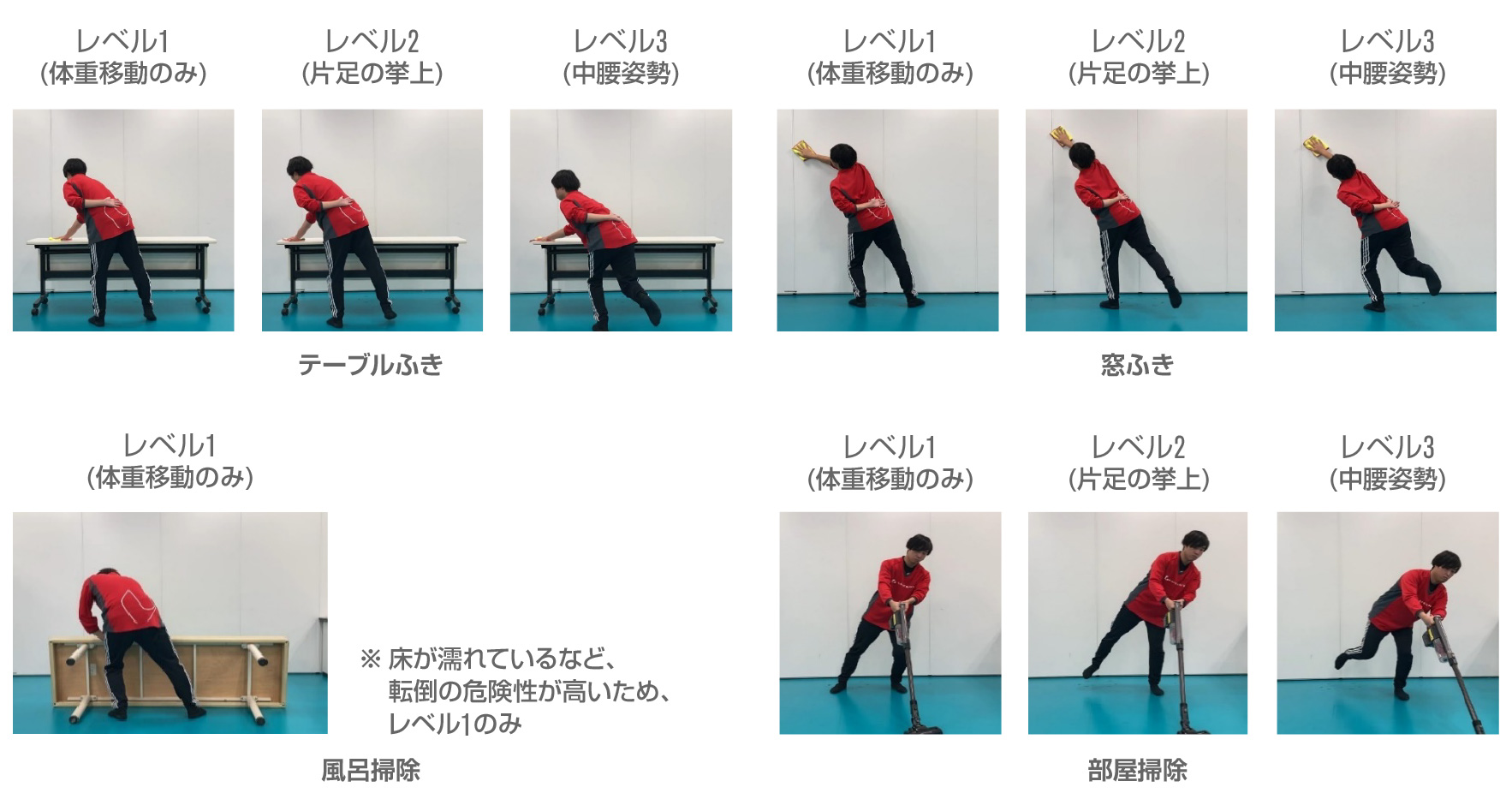 作成した日常の生活活動改善メニューの中には掃除(テーブルふき、窓ふき、風呂掃除、部屋掃除)に関する項目がいくつかありますが、より身体機能を高めるために「スケートぴかぴか掃除」を創案しました(図1)。スケートぴかぴか掃除はスケートの動きを取り入れ、左右へ身体を動かしたり、片足立ちになって体重を乗せたりしながら掃除します。一般的な掃除よりも身体への負荷が高いため、身体活動量の増加が期待できます。項目によってレベル1~3までを設定しているため、ご自身の体力レベルやその日の体調に合わせた強度で実施することができます。