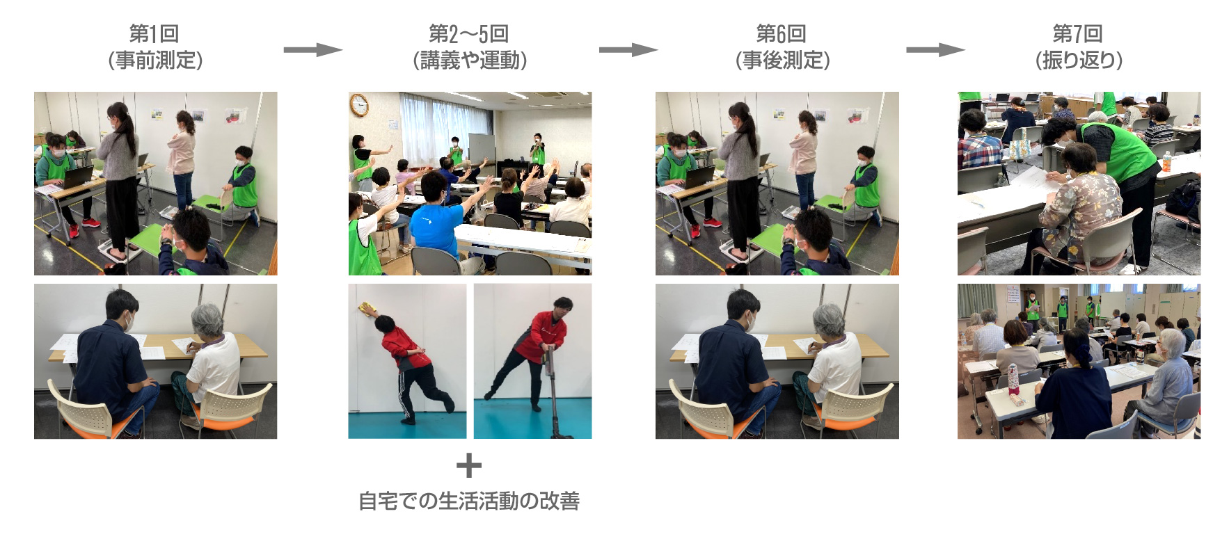 「シニアのための健康・安全運転講座」と題した2か月間の講座を企画し、65歳以上の高齢者25名に参加していただきました。講座は1回90分で1~2週間おきに全7回実施しました。初回は、身体機能や認知機能の測定を行い、生活活動改善メニューの説明と実施の協力をお願いしました。第2回~第5回は、毎回テーマを変えて講義や軽い体操を行いました(図3)。第6回は、生活活動改善後の身体機能や認知機能を把握するため、再び測定を行いました。第7回は、結果の振り返りを行いました。生活活動改善の協力者には、1日の終わりにご自身の生活を振り返ってもらい、実施できた項目をチェックシートに毎日記入してもらいました。初回と第6回の測定に参加し、期間中を通して生活活動の改善に取り組んだ12名(男性3名、女性9名:76.3±4.4歳)を評価の対象者としました。