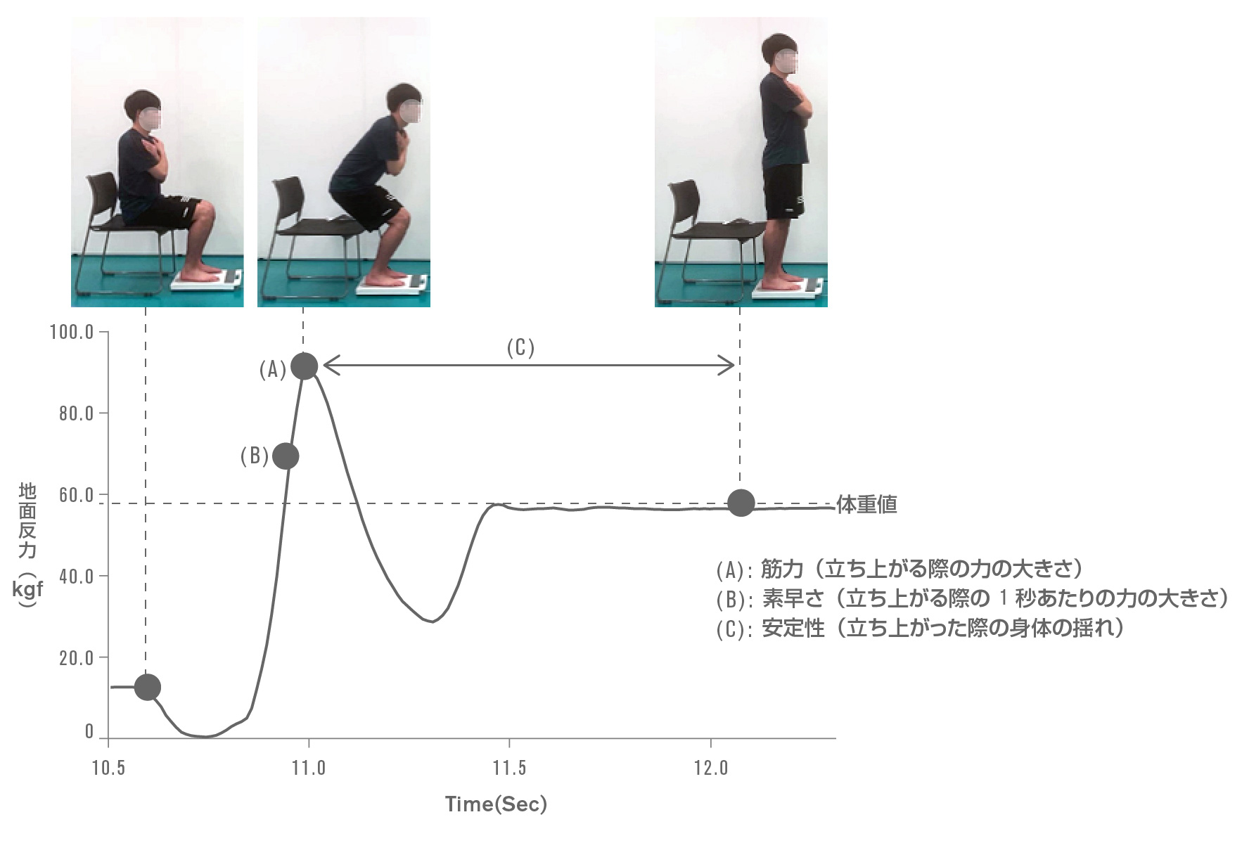 両腕を胸の前で組み、椅子に座った状態から素早く立つ・座る動作を3回測定しました。専用の機器の上に両足を乗せて動作を行うことで、椅子から立ち上がる際の力の分布を測定でき、下肢筋力やバランス能力を調べることができます(図4)。筋力(立ち上がる際の力の大きさ)、素早さ(立ち上がる際の1秒あたりの力の大きさ)、安定性(立ち上がった際の身体の揺れ)の3つを評価指標としました。いずれの指標も値が高いほど、下肢機能が良好であることを示します。