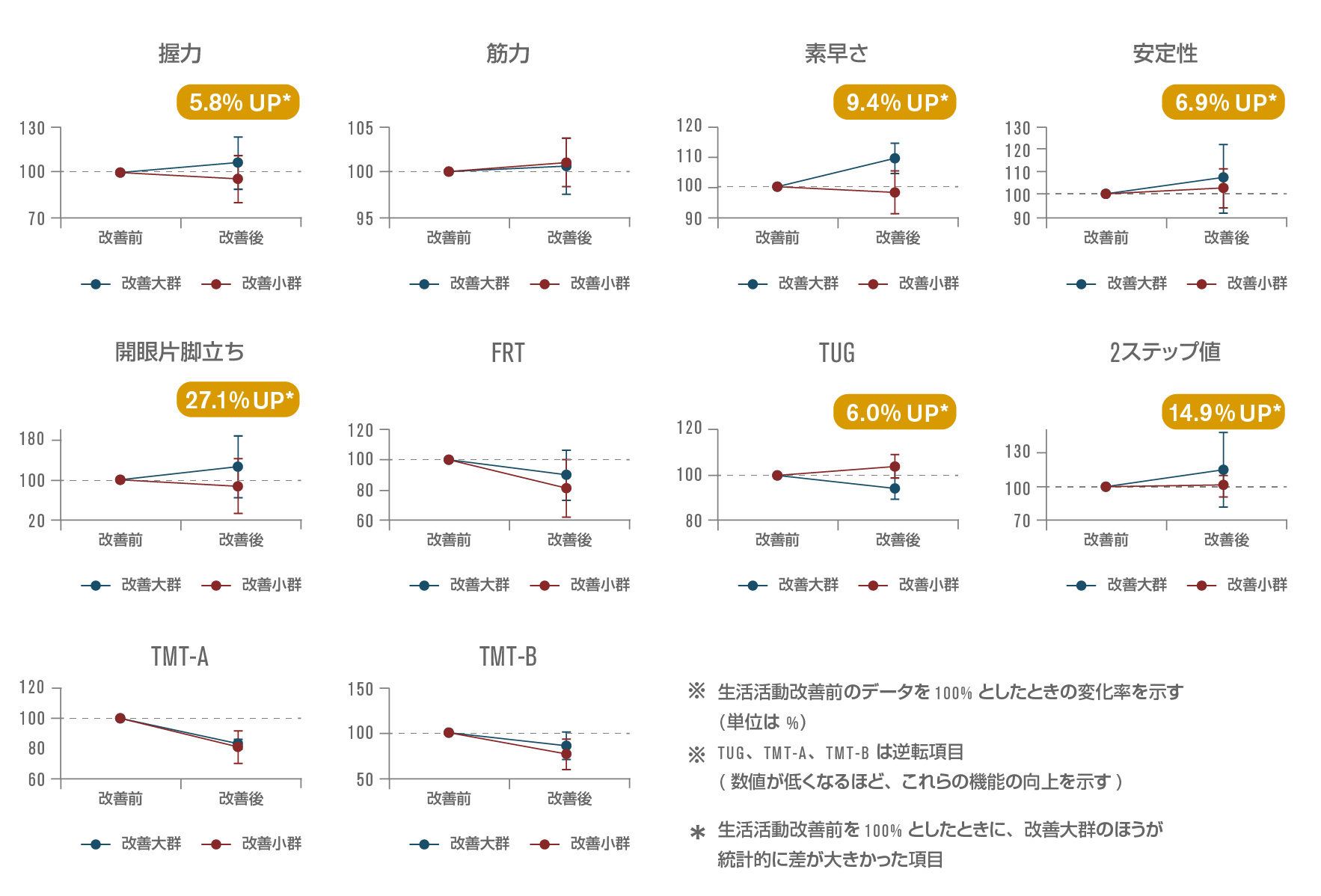生活活動ポイントの平均値である29.2ポイントを基準に、生活活動の改善が多かった人6名(以下、改善大群)と少なかった人6名(以下、改善小群)の2群に分けて、生活活動の改善前後での身体機能と認知機能の変化量を比較しました(図5)。その結果、改善大群は握力、椅子立ち上がりテストの素早さと安定性、開眼片脚立ち、TUG、2ステップ値で機能の向上がみられました。人数は少ないながらも、生活活動を改善すれば、身体機能が回復することがわかりました。